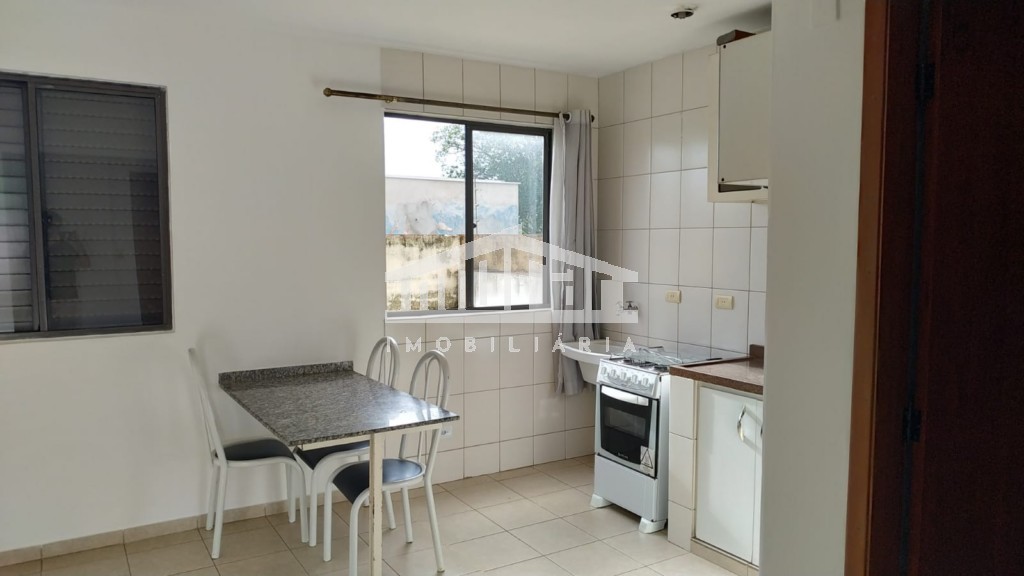 Esta quitinete está disponível para locação e já vem com mesa e cadeiras, fogão e pia.